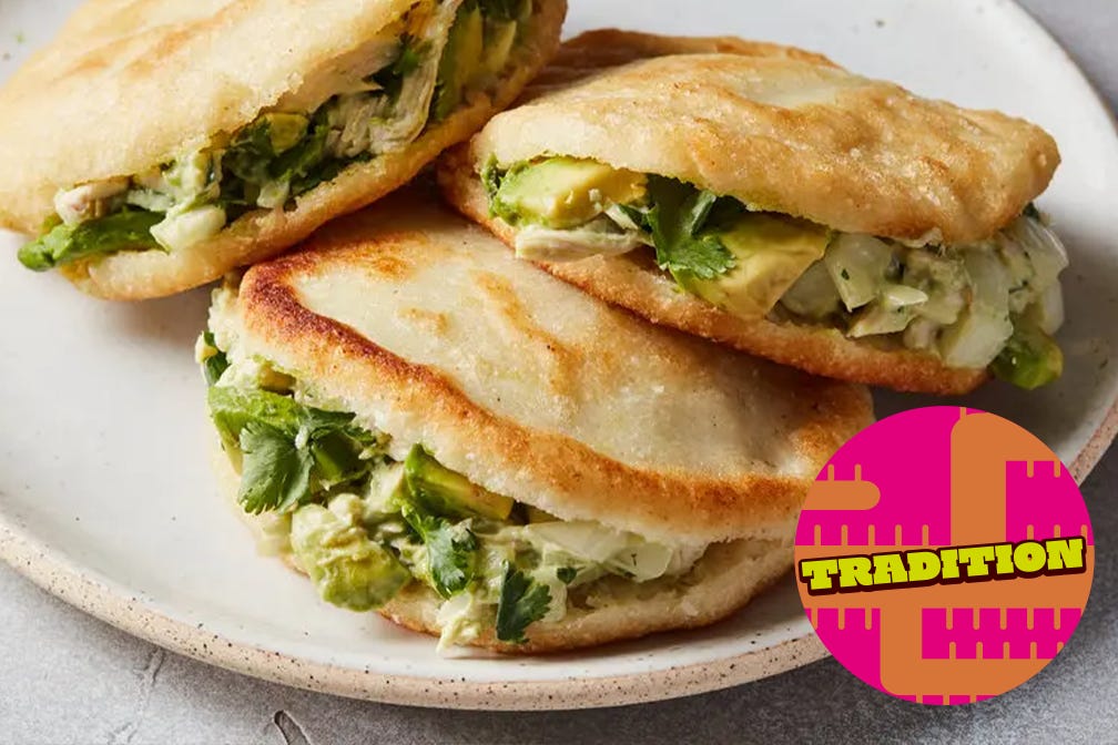 These chicken and avocado-stuffed arepas, which are known as reina pepiada (or curvy queen), were created in honor of Susana Dujim, a Venezuelan beauty queen who was crowned Miss World in 1955. The 1950s also marked the invention of precooked corn flour, now known as masarepa, by a Venezuelan engineer. But arepas were around for hundreds of years throughout Latin America before that, the corn patties sometimes served whole or split, then filled with countless combinations. Preparing them used to be labor-intensive, but masarepa gives arepas a light and creamy texture without a lot of effort. Unlike cornmeal used for cornbread or muffins, which is ground dried uncooked corn, masarepa is ground from cooked corn and conveniently sold as dried corn flour. Masa harina is ground uncooked corn treated with other ingredients and is used to make tortillas and other dishes. Neither cornmeal nor masa harina can be substituted for masarepa, which is available online and in many supermarkets.