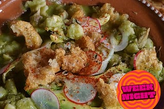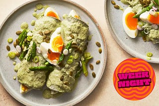 In this late-spring version, jammy eggs and blanched asparagus serve as the filling, and an uncooked sauce of pepitas and jalapeños finishes everything…